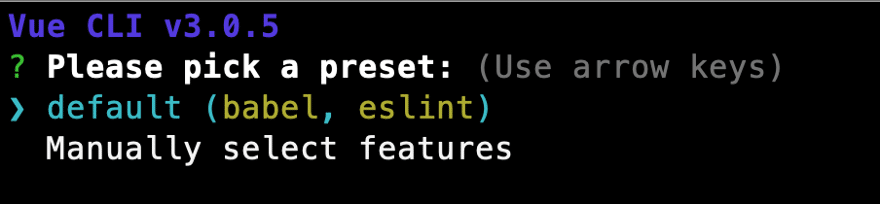 The Vue CLI will prompt you to pick a preset. You have the option of selecting the default preset or manually selecting features. I chose default.