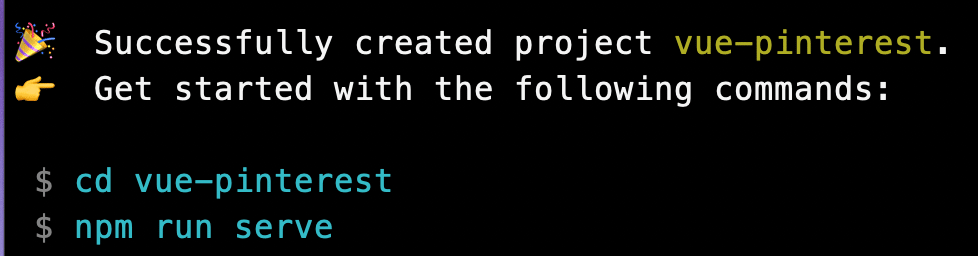 We can now use the Vue cli to create our application. I am going to call my application vue-pinterest. To create the application enter this command in your terminal: