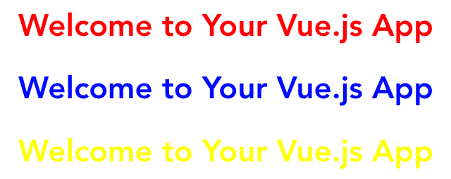 Now our directive is much more flexible. You can pass in any of the well-known color strings like ‘red’ or ‘blue’ as well as pass in a valid hex color like #ffff00. Here is an image of our new v-color directive being applied three times. The first time the color is red, the second time the color is blue and the last time the color is yellow using the hex code of #ffff00.