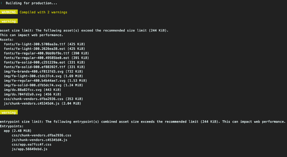Vue recommends that bundles not exceed a size of 244 KiB. We have 14 assets alone where each exceeds this size. In addition, we have four entry points that are also above the recommended size. Here is what I did to reduce the size of our build in half.