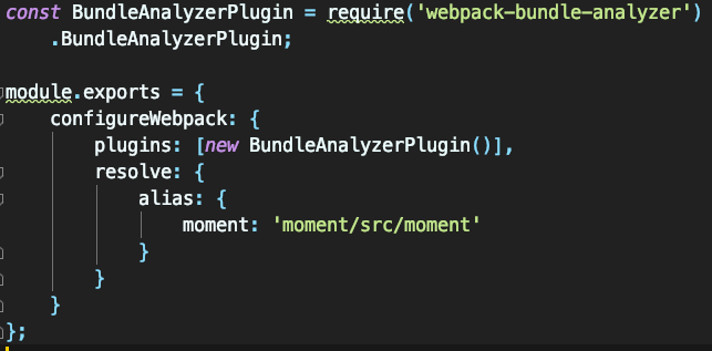So the tradeoff was to create a shortcut alias in webpack. The shortcut would substitute all calls that import ‘moment’ with ‘moment/src/moment’. We can add that alias in our vue.config.js file using resolve and setting an alias. Here is what my vue.config.js file looks like now.