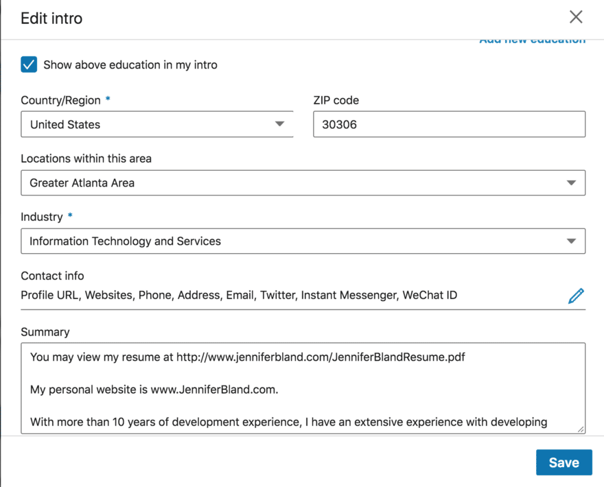 Skills is another area that recruiters are able to search for using LinkedIn Recruiter. I would recommend putting in all the skills that match the technology area that you want to get a job. You have the option of ordering this list. I would put the skills that you definitely are seeking in a job at the top. The other reason for having the most important skills listed first is when people view your profile, LinkedIn will give them an option to endorse you for your skills. They will only be shown the top four listed skills.